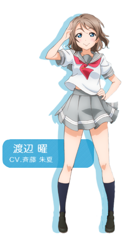 En los momentos previos al lanzamiento de la serie, se esperaba que Dia fuese una copia al carbón de Eli Ayase, ya que ambas fueron presidentes del Consejo Estudiantil de sus respectivas escuelas. De hecho, ambas mostraban personalidades frías y negadas a la creación de grupos de School Idols. Lo curioso es que ambas tenían motivaciones diferentes. Hablemos en este caso de la mayor de las hermanas Kurosawa. Para empezar, Dia es una flaca hermosa, estilizada, con un lunar que le sube el sexappeal en un altísimo porcentaje. Su larga cabellera negra y su flequillo son su carta de presentación. Sus ojazos verdes intimidan al más pintado. Ahora, ¿Por qué ella se oponía a que se creara el grupo que Chika quería? ¿Por qué apostaba al fracaso? No porque despreciara a las Idols, de hecho, en ese carácter frío se ocultaba a la fanática número 1 del movimiento de School Idols, sobre todo de las µ's. Su conocimiento del tema llegaba a niveles casi enfermizos. Su relación con su hermana se hizo aún más fuerte gracias a este fanatismo, y para rematar, ella con sus amigas y compañeras de curso (en aquel momento de primer año) decidieron convertirse en School Idols para competir en el Love Live. Aquí comenzaría una historia llena de intrigas y misterios que posteriormente se despejaría. Ahora, ¿Por qué está en el segundo puesto igualada con Yohane? Por varias razones. Representó perfectamente al sector del fandom que se quedó en las comparaciones odiosas entre las musas y Aqours, cuando aún la historia no estaba bien desarrollada. Sus confrontaciones fueron emblemáticas. No es un personaje de hablar mucho, pero cada vez que lo hacía, mostraba contundencia, firmeza, carácter. Ahora, cuando hablaba de µ's, se convertía en un mar de conocimientos, con una autoridad que por trazos recordaba a Nico Yazawa hablando de las Idols. Su mejor escena: Son varias. Sus confrontaciones con Chika fueron todas magníficas, sus clases de la materia Idol también fueron geniales. Para la segunda temporada, debido al llamado "ship" de los fanáticos, se espera más interacción entre Dia y Yohane. De ser así, Dia se convertirá en uno de los personajes más divertidos de la serie.1º lugar (La Waifu de Agua): You Watanabe.
